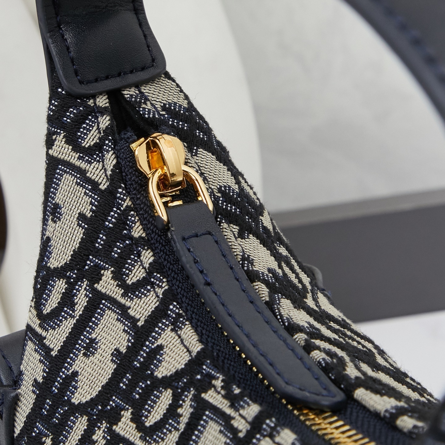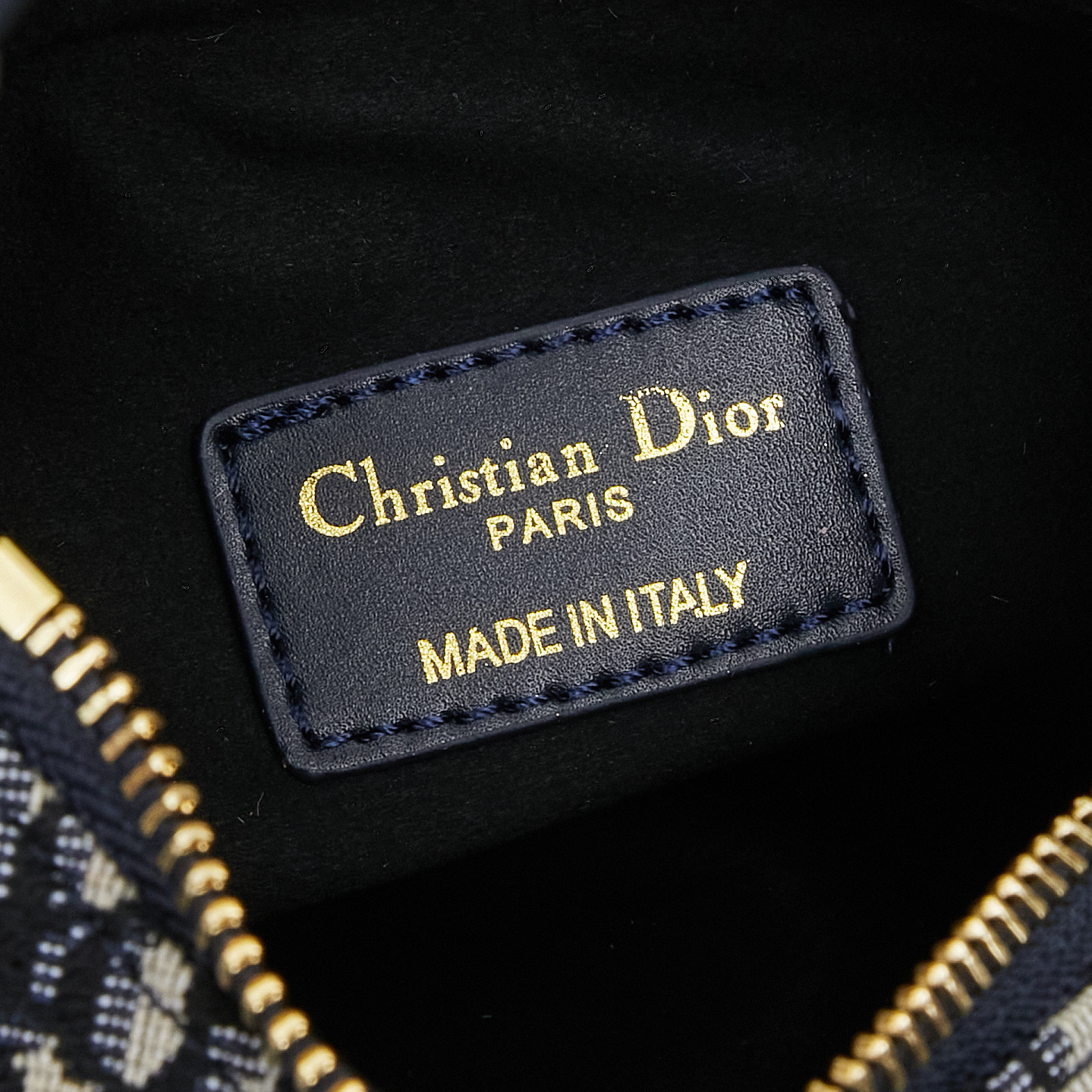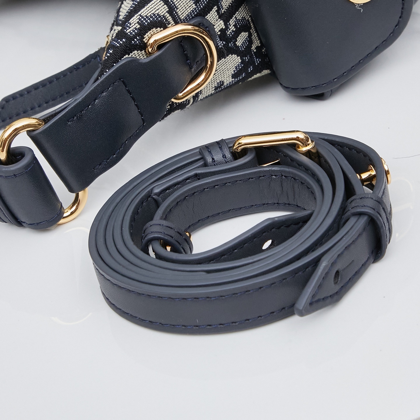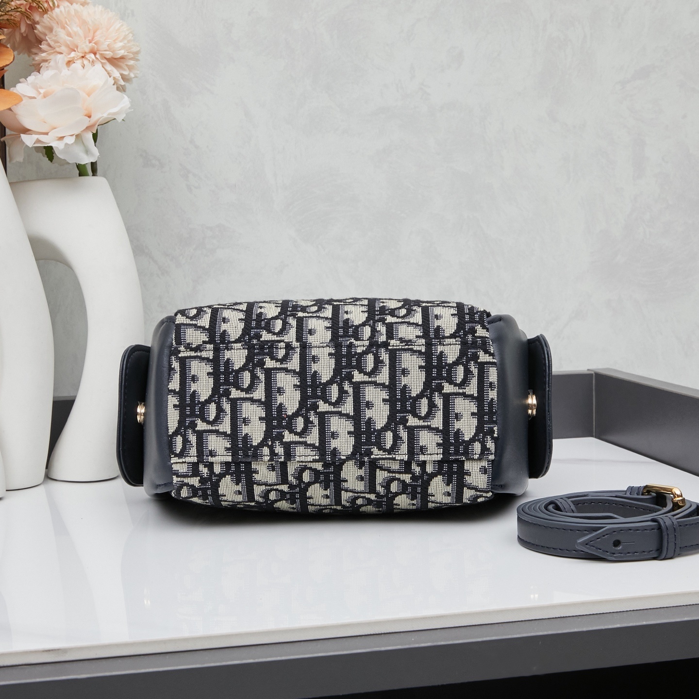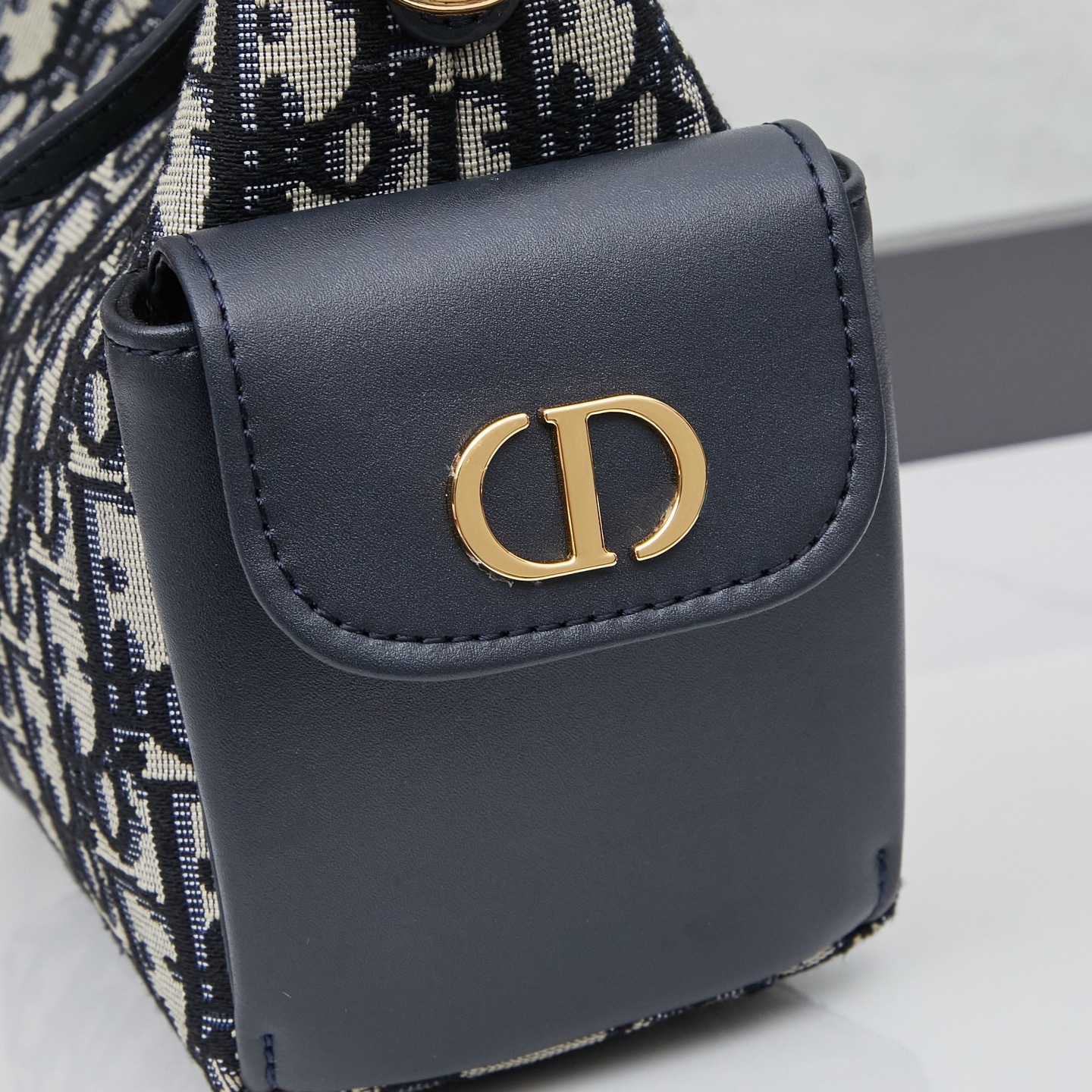 バッグ両サイドにはレトロゴールドメッキ金属製のCDロゴを配しました。シャープな彫刻と控えめな光沢が、ブルーカーフレザーの地味さに「力強いアクセント」を添え、「さりげないブランドアピール」を実現。ロゴの配置は「主張しすぎない」よう計算され、シンプルながらも「唯一無二の個性」を演出します。