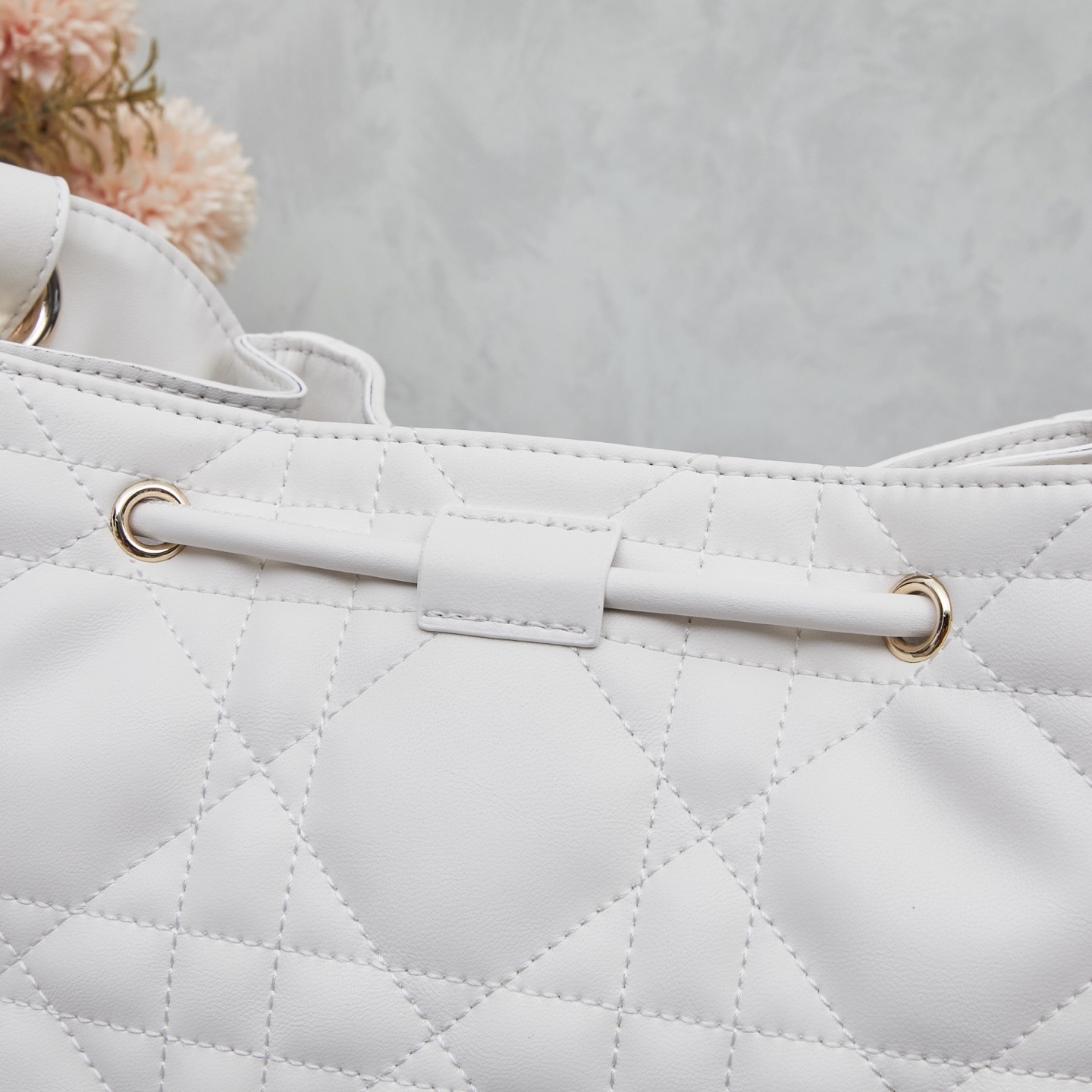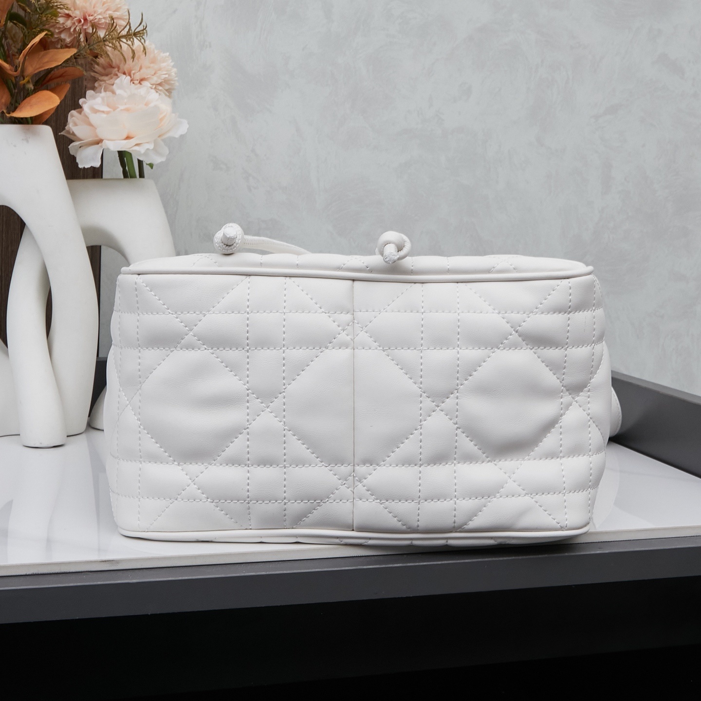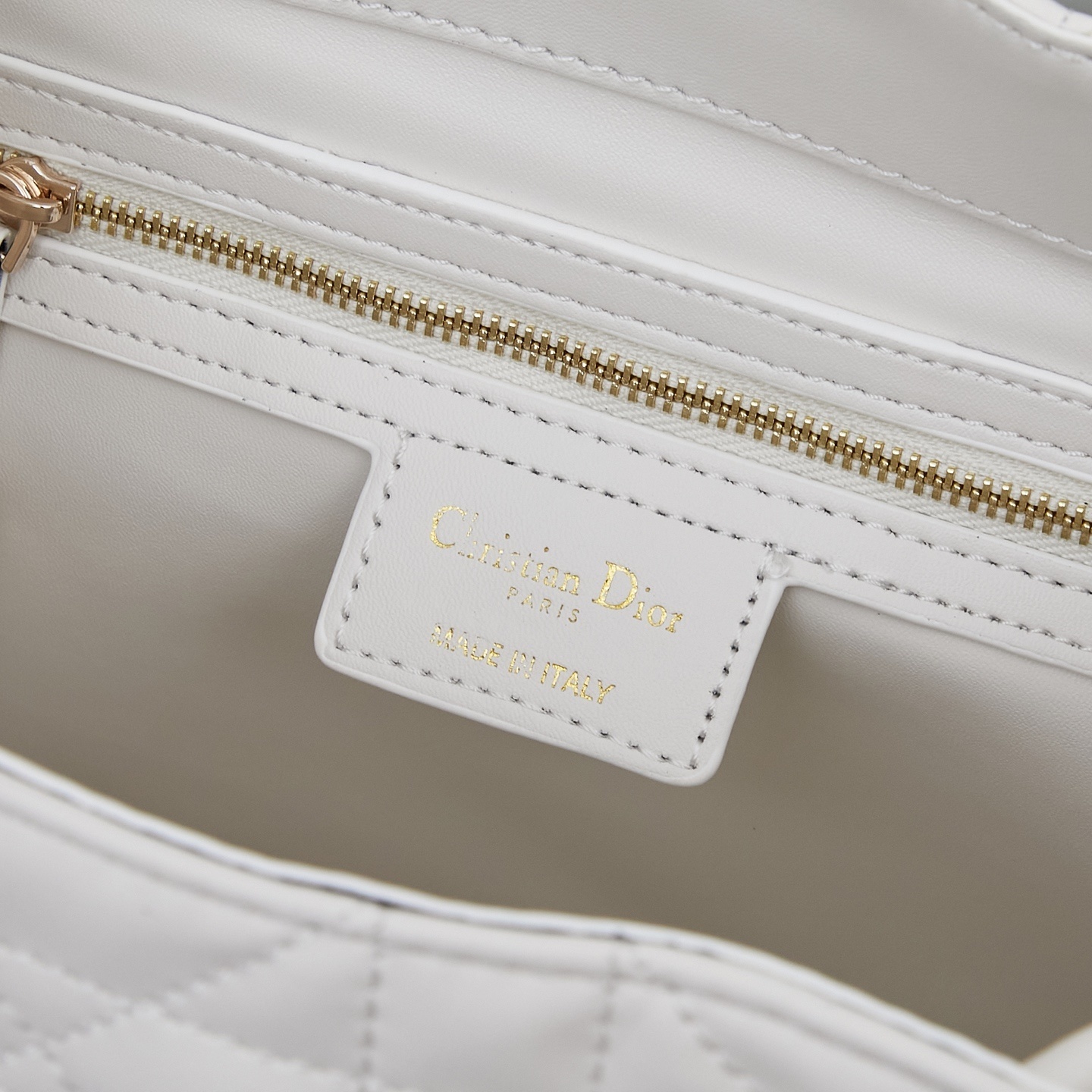 バッグ全面にはディオールの象徴「カンバセラージュ(藤格纹)ステッチ」を施しました。深く刻まれたステッチが立体的な陰影を生み出し、ラムスキーの柔らかさに「モダンなアクセント」を添えます。職人の手仕事によるステッチの均一性が「本物の証」となります。