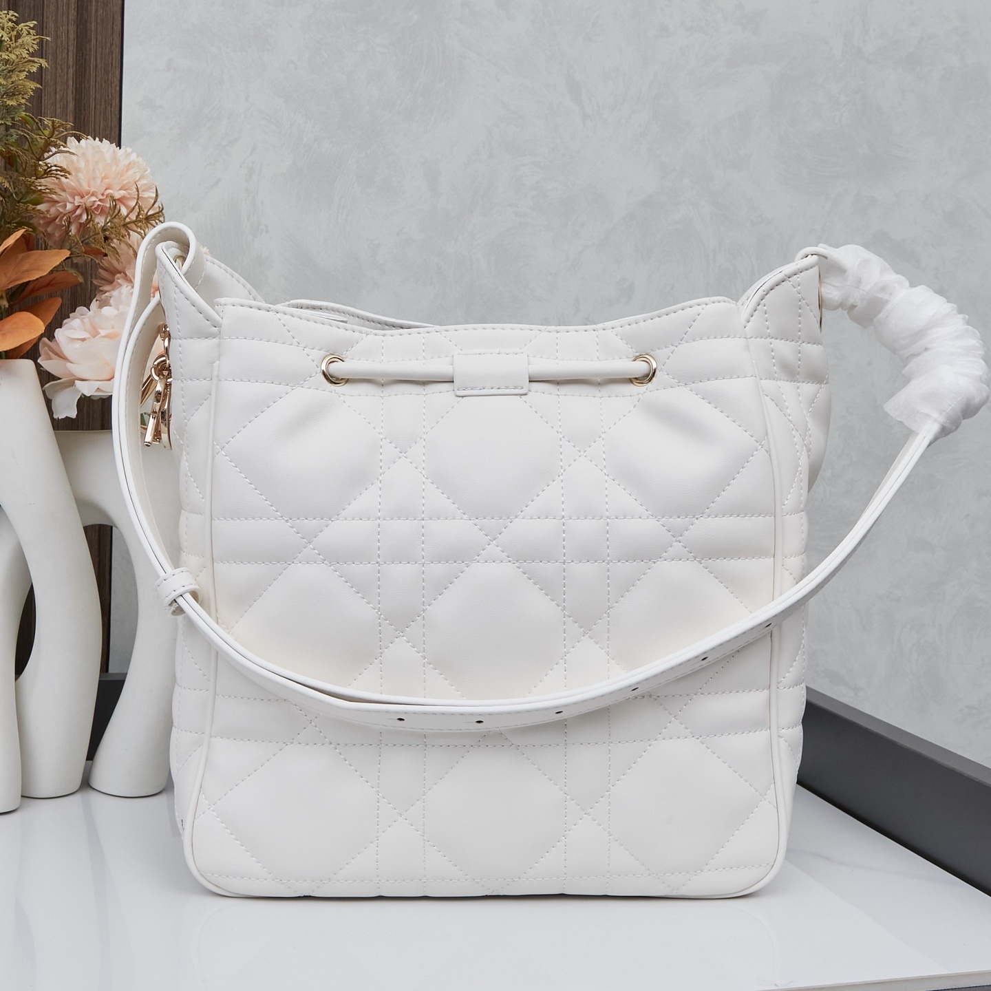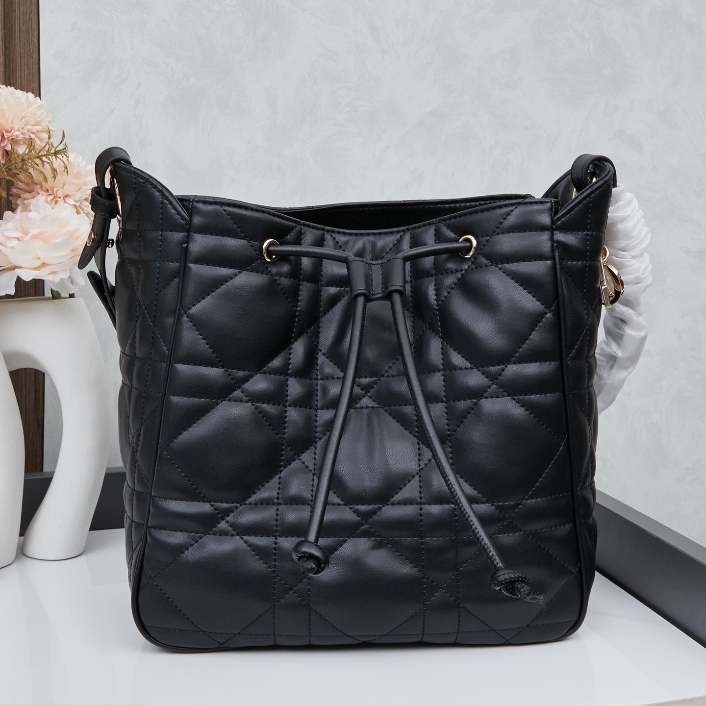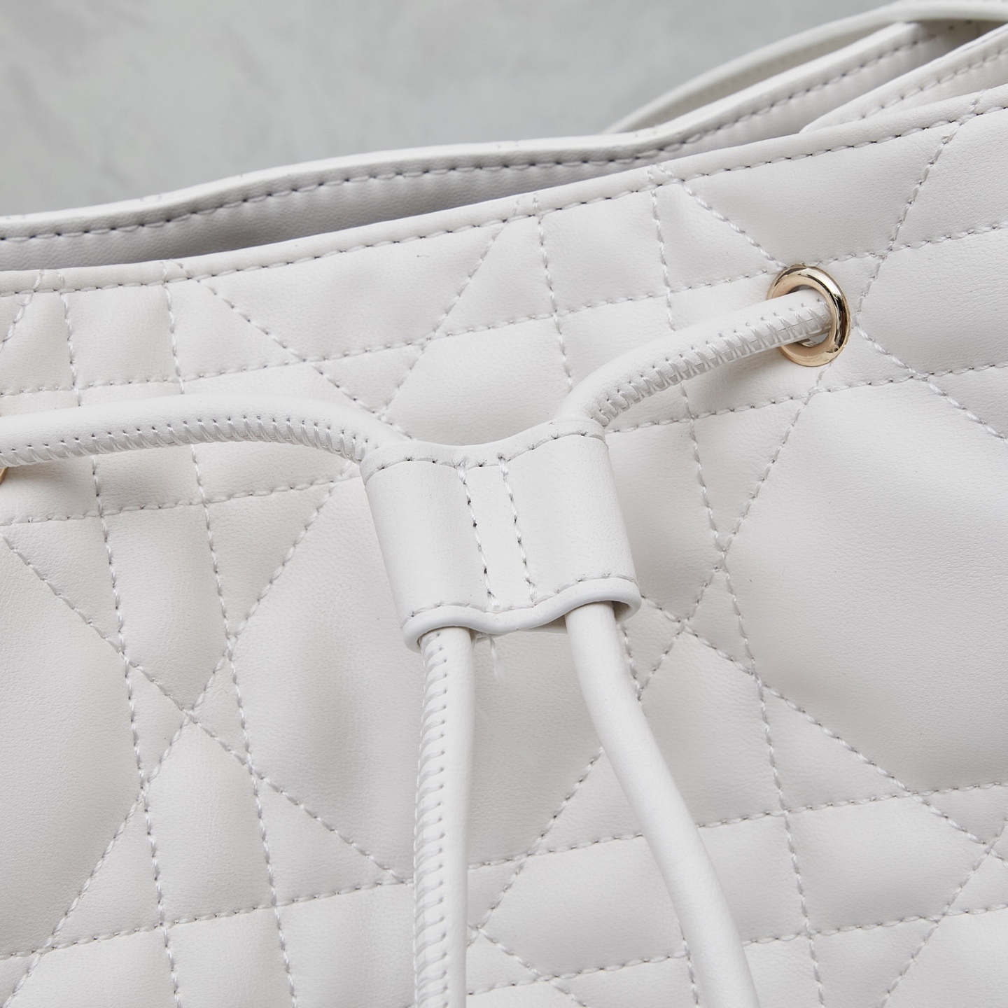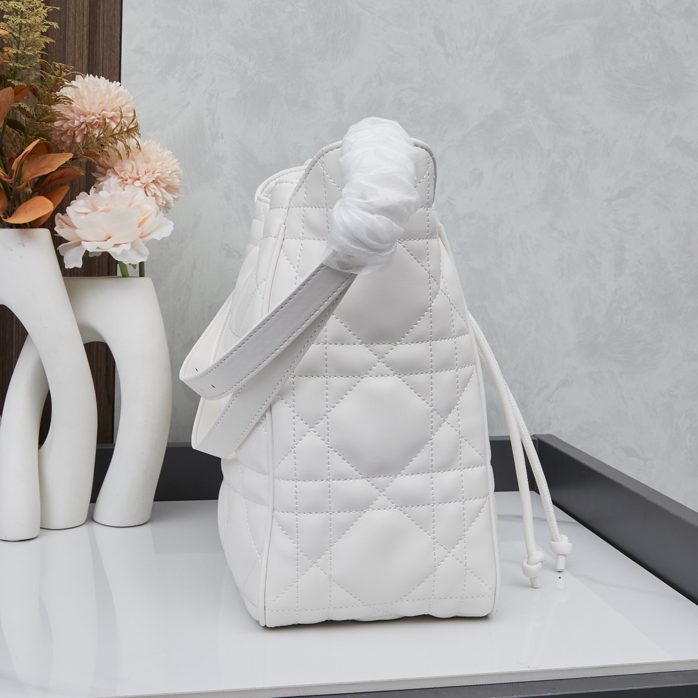 バッグ全面にはディオールの象徴「カンバセラージュ(藤格纹)ステッチ」を施しました。深く刻まれたステッチが立体的な陰影を生み出し、ラムスキーの柔らかさに「モダンなアクセント」を添えます。職人の手仕事によるステッチの均一性が「本物の証」となります。