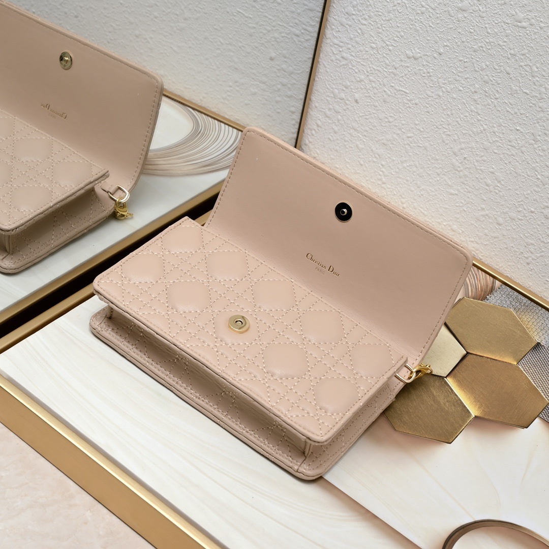 ・ヴィンテージゴールドCDロゴの輝き:フラップ中央のCDロゴは、1950年代のディオールアーカイブを参考にデザイン。ヴィンテージゴールドトーンメタルの磨き上げられた光沢が、「遠くからでもディオールとわかる」存在感を放ちます。ロゴ周囲の彫金細工が「手仕事の温もり」を演出。