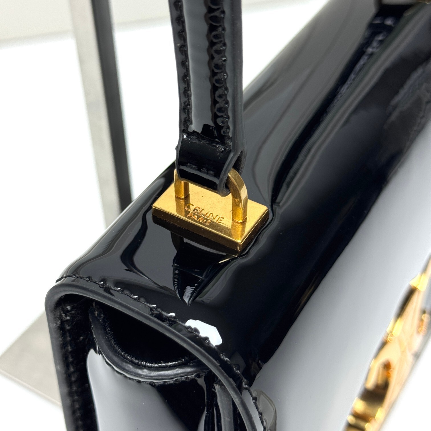 デザイン:ミニハンドバッグ / 漆皮牛革(ラッカー加工牛革・フランス産) / 長肩帯(牛革製・長さ調節可能・約50-60cm) / 腋下背/肩背2WAY / マグネット式フラップ留め具(CELINEロゴプレート付き) / 薄型デザイン(奥行7cm) / ゴールドトーンメタル金具(リング・ロゴプレート)