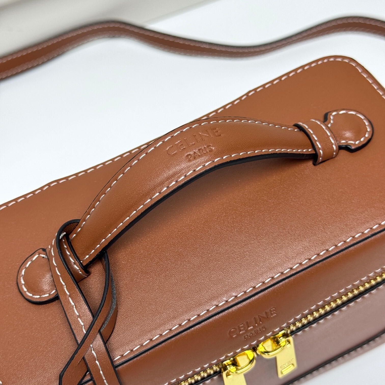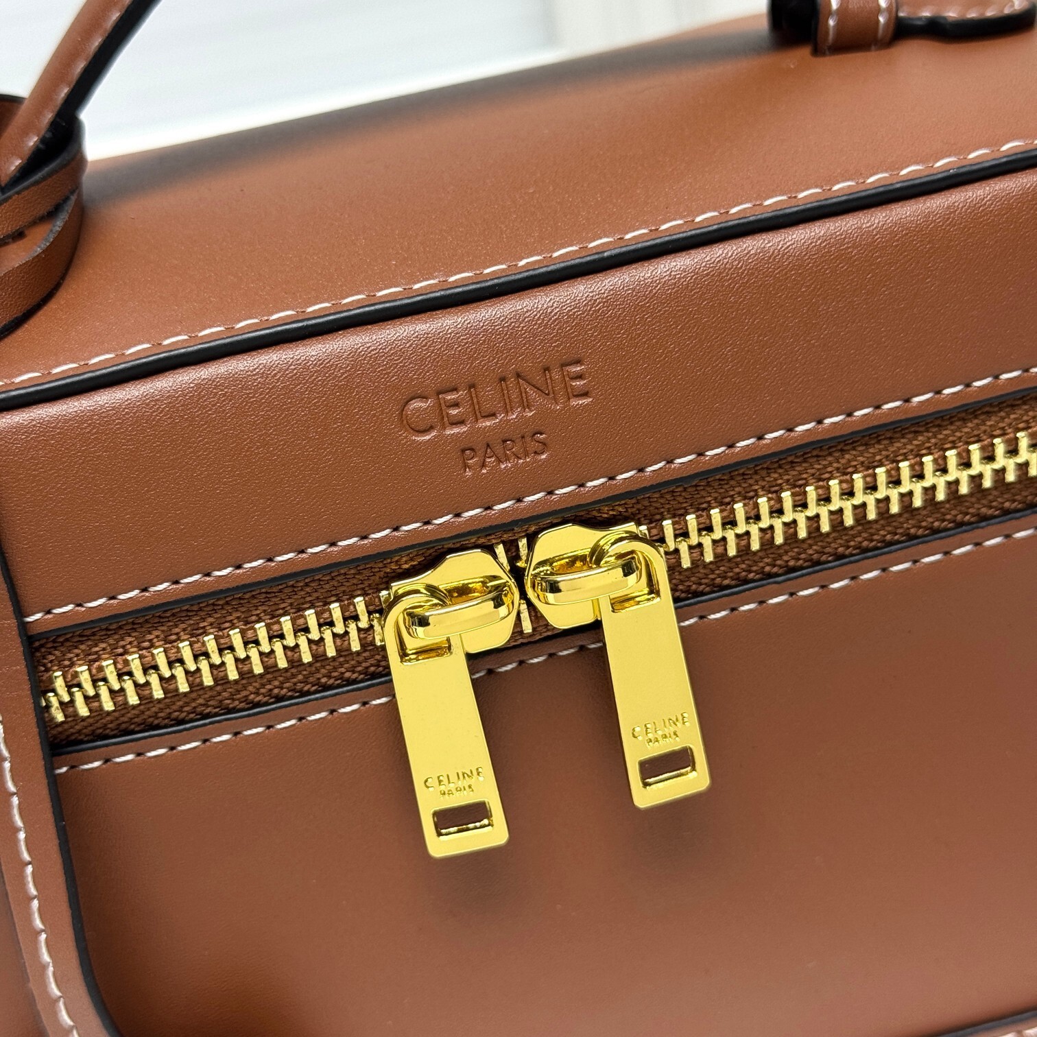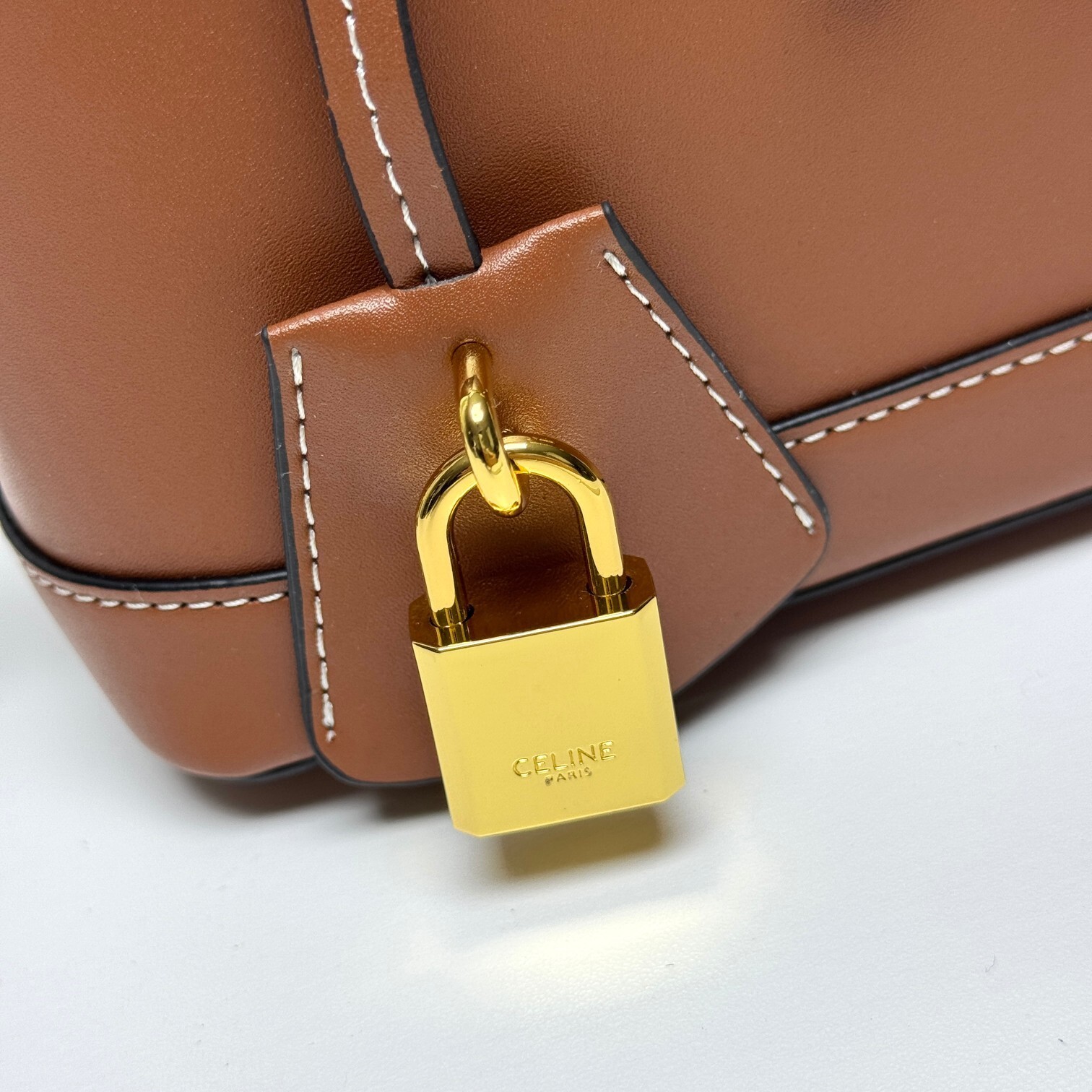 ・天然牛革(ベビーカーフ)の芸術:本体全面に使用したフランス産天然牛革(ベビーカーフ)は、セリーヌ工房が「最も尊貴な原版皮」と位置づける素材。表面の微細な粒面が「指先で感じるしっとりとした肉厚感」を演出し、「使い込むほどに深まる自然なシワ」が「レトロな味わい」を予感させる。「質感が結実し、精巧な構造を形成する」特性を活かし、「型崩れしにくい立体感」を実現(「可塑造精巧鮮明结构」の所以)。