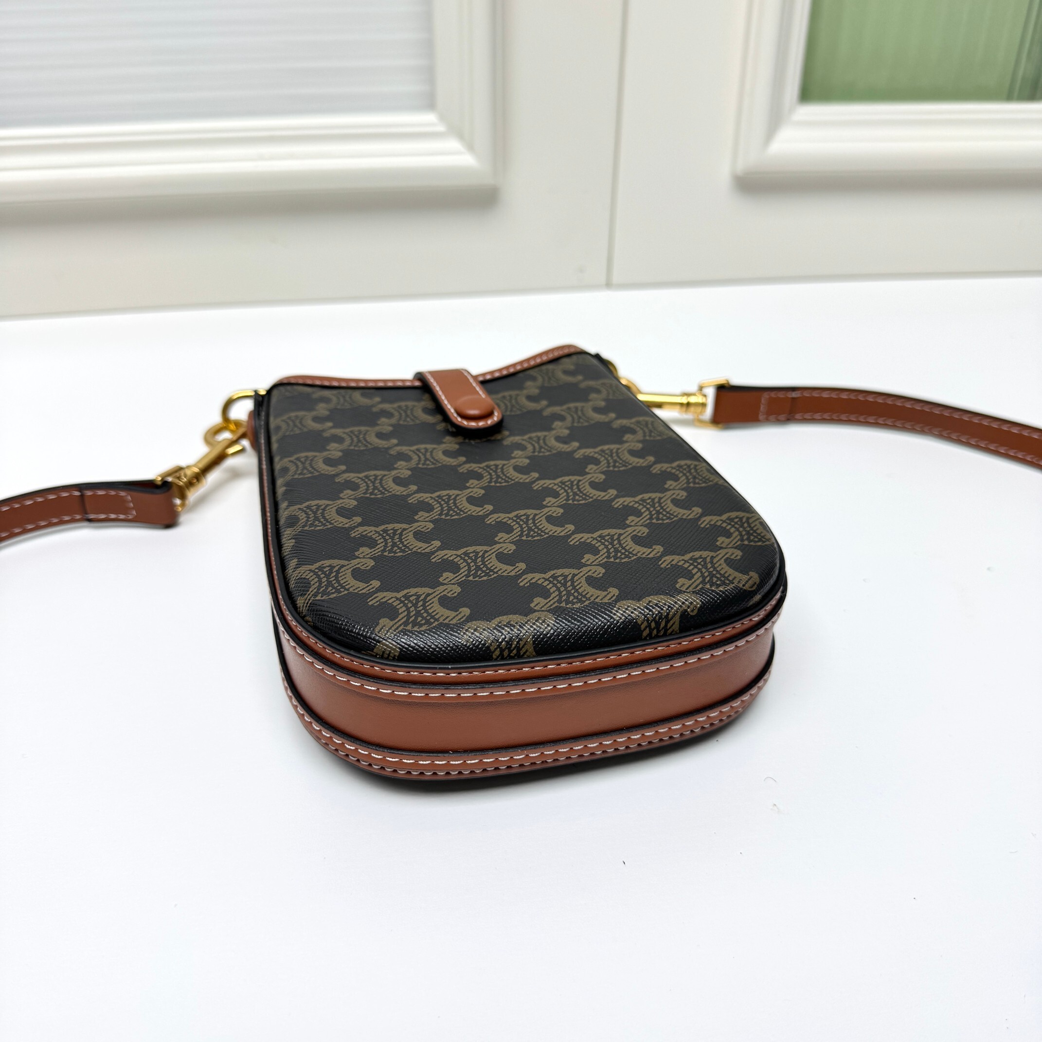 デザイン:スマホポーチ / 牛革(フランス産・挺括加工) / ミニマルフォルム(CELINEロゴ刻印) / 調節可能ショルダーストラップ(牛革製・80-110cm) / マグネット式フラップ留め具 / 薄型補強板(自立可能) / 内側メインコンパートメント(オープン)