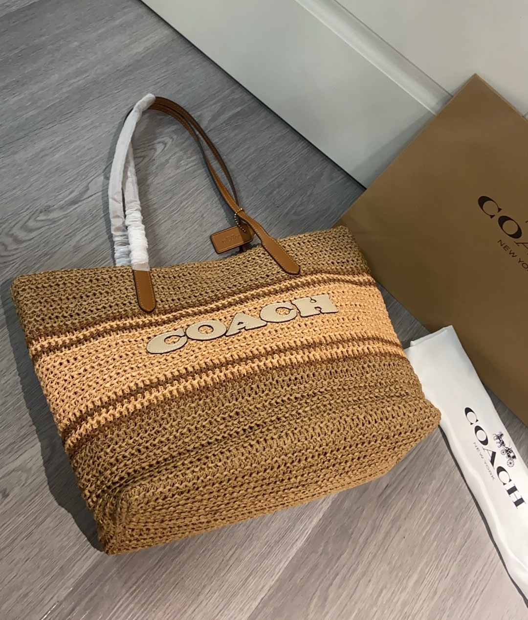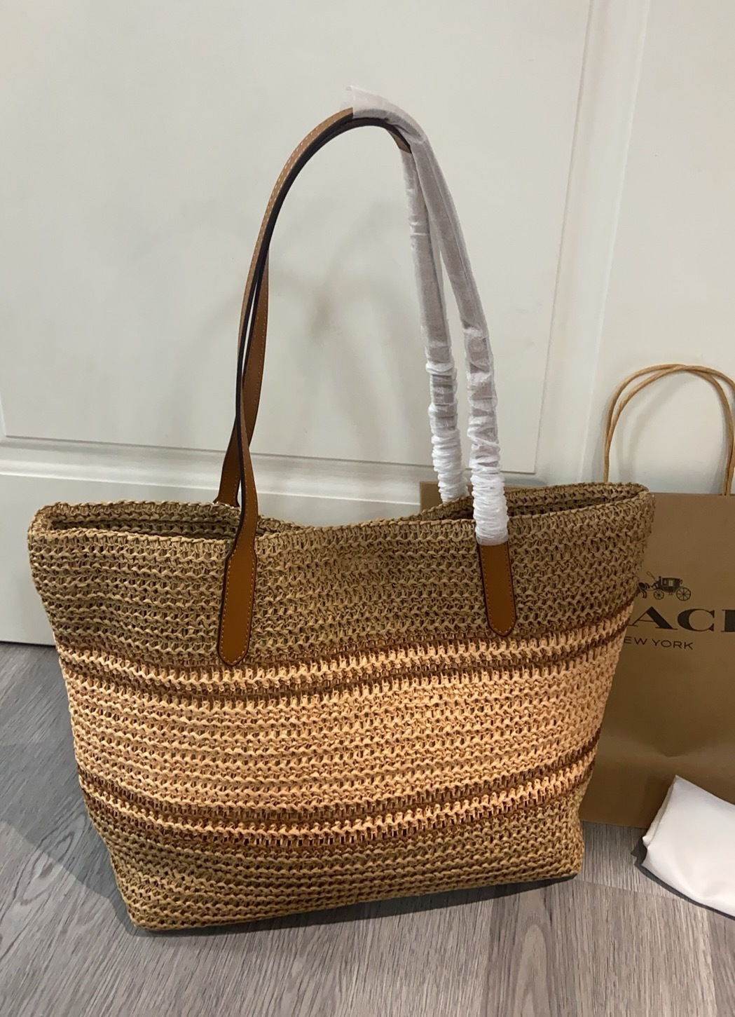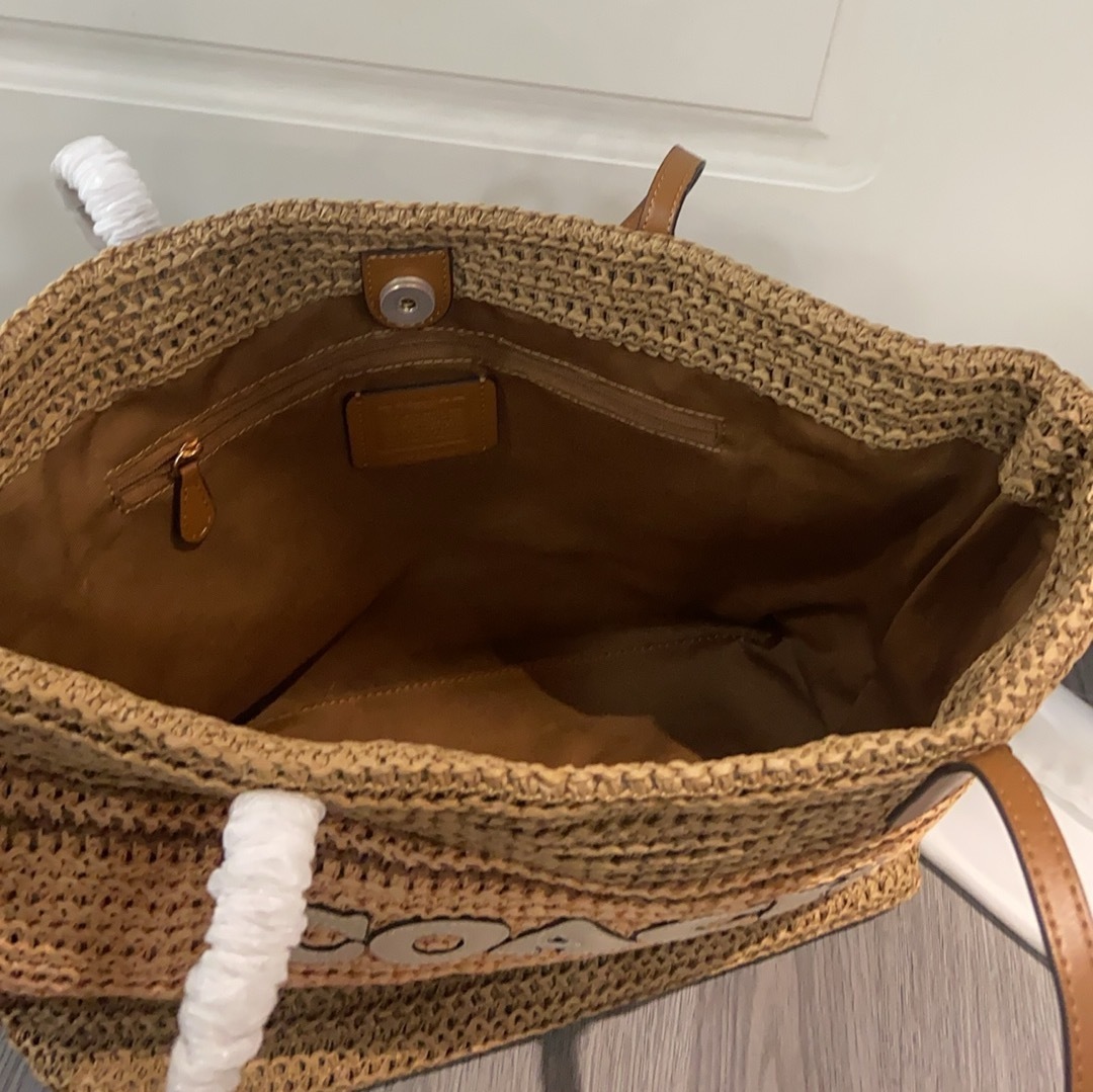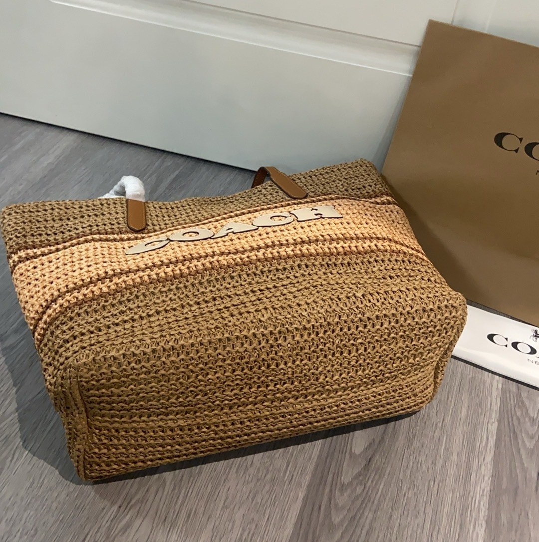 コーチ LMXJ7 新作 ラフィア草 トートバッグ|編み交差デザイン×3配色|柔らかい手触り・硬くない草感|牛革ハンドル付き・34×55×16cm|整然とした編み目・しなやかな耐久性