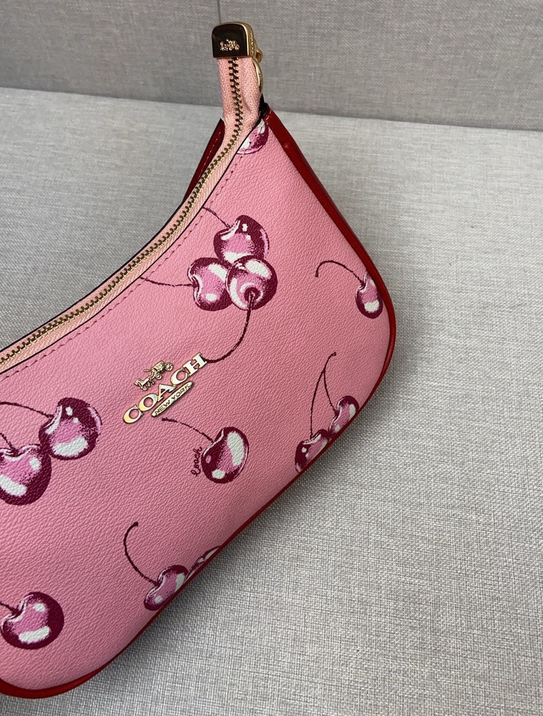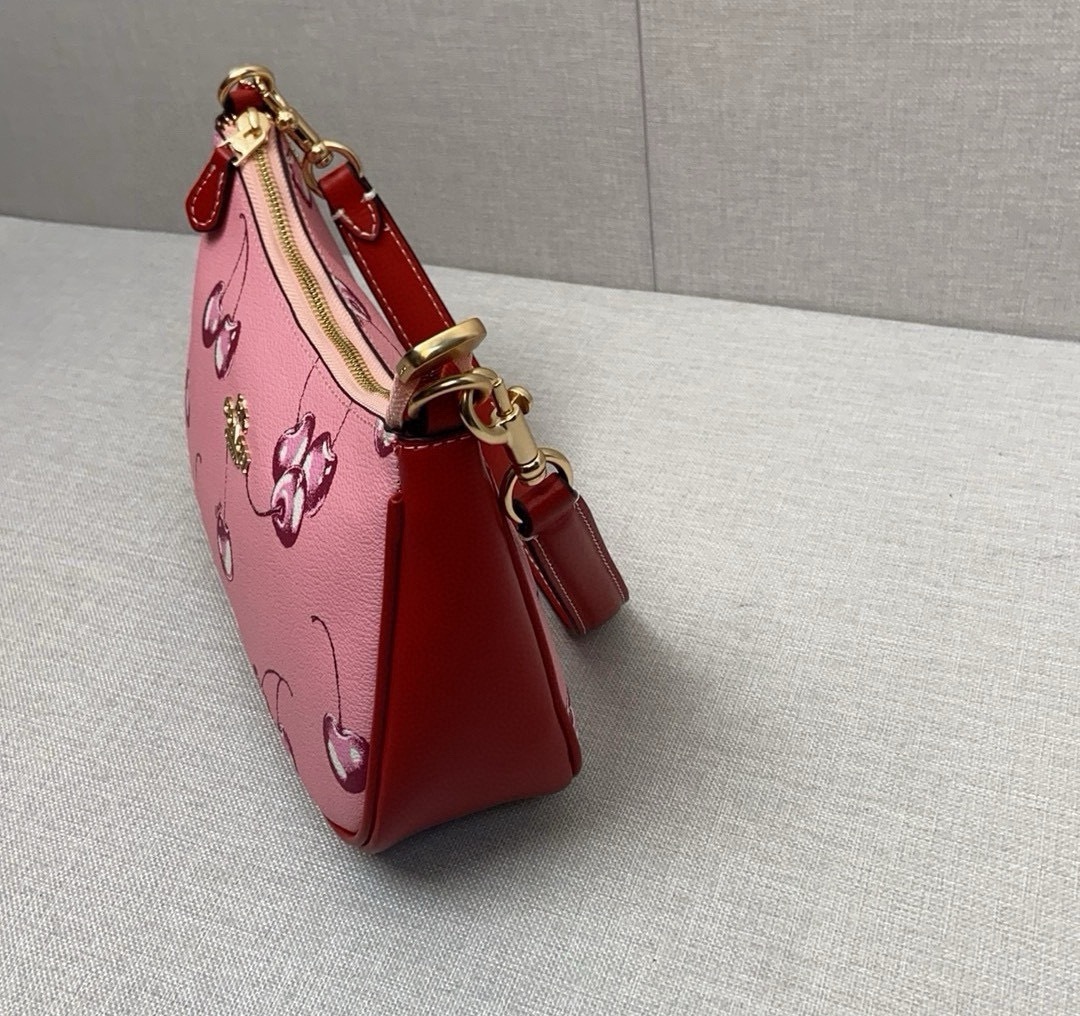 ・ コーチC字ロゴの控えめな輝き:前面下部に配されたエンボス加工C字ロゴは、「チェリー柄の主張を和らげ、ブランドのDNAをさりげなく主張」。一目でコーチと識別できる安心感を与えます(「Coach蔻驰」の伝承)。