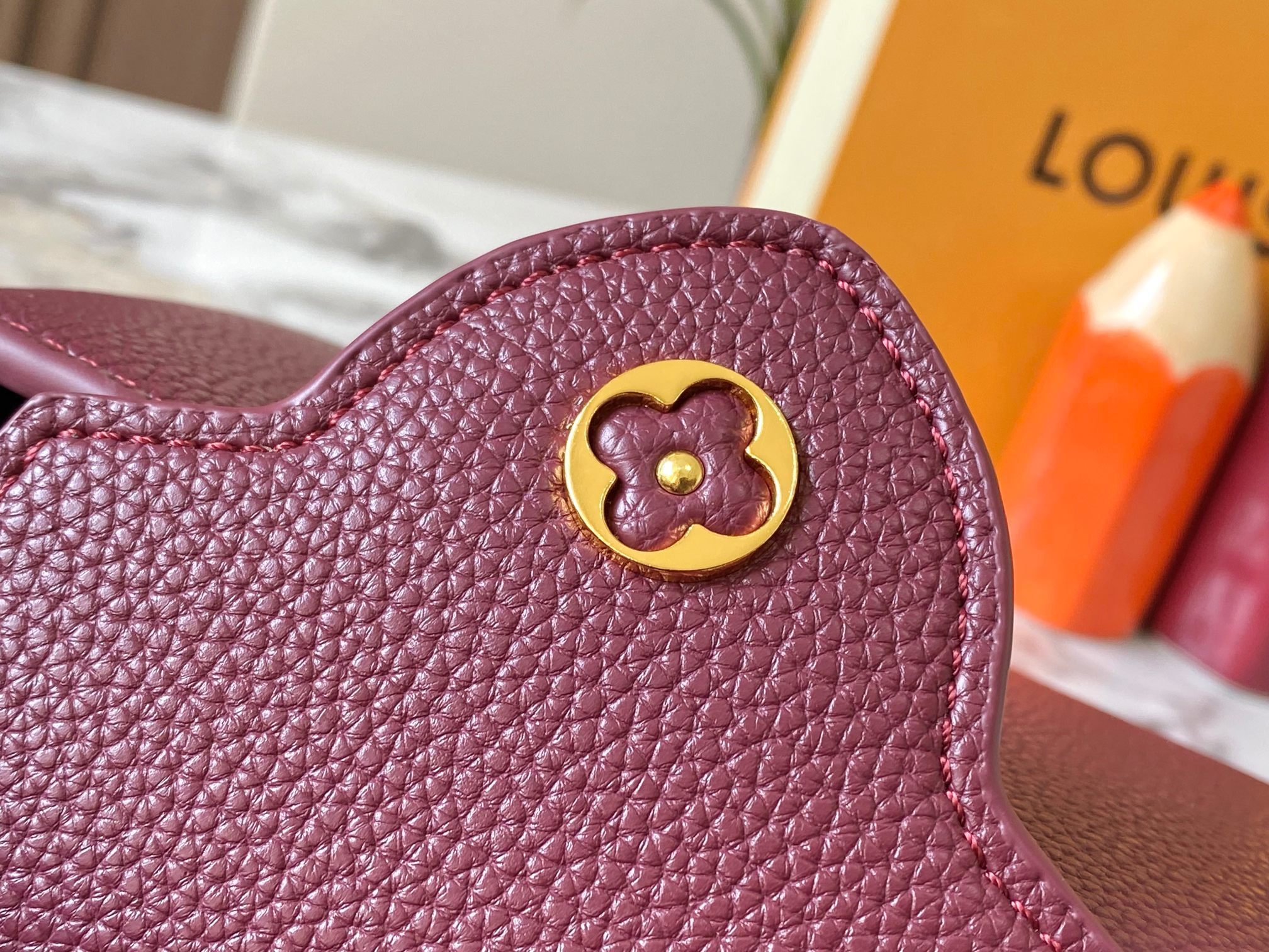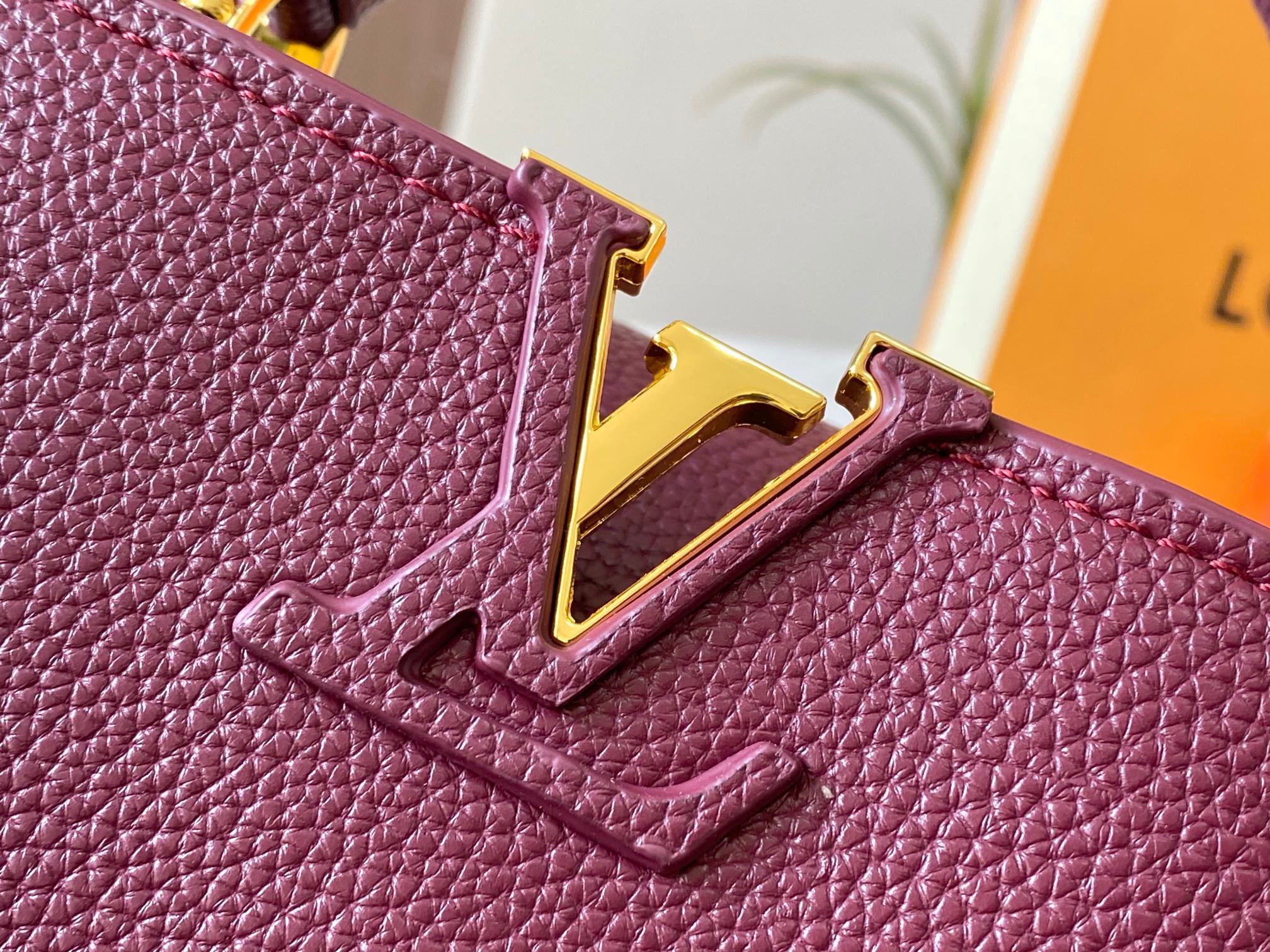 ルイ・ヴィトン Capucines ミニハンドバッグ|モノグラム花卉ハンドル×全粒面タウリヨンレザー・21×14×8cm・立体LVロゴ・柔美デザイン