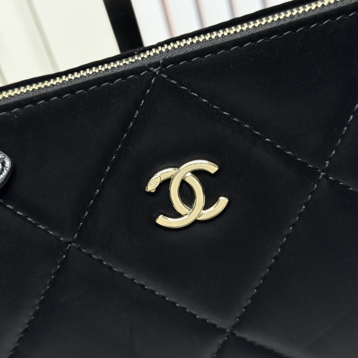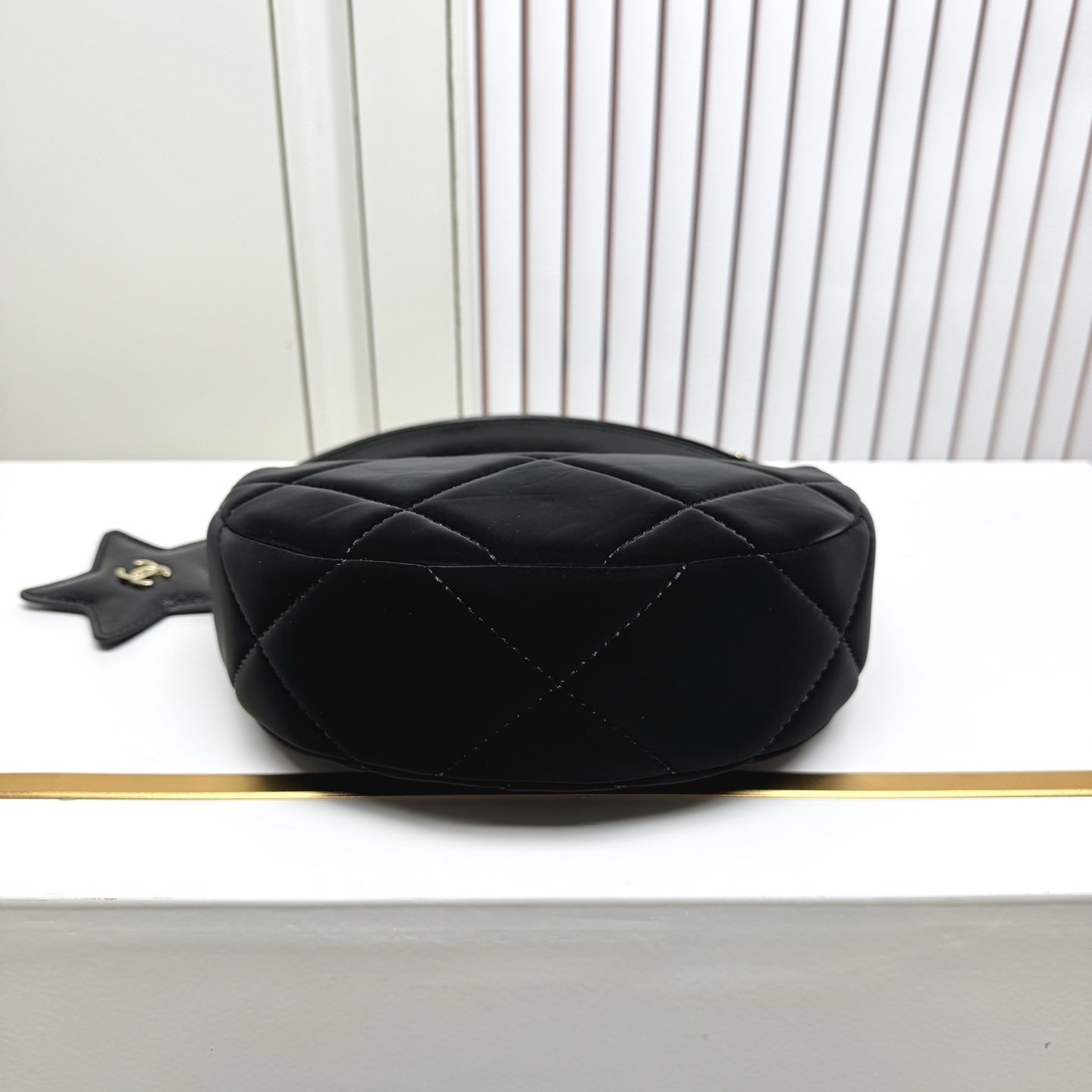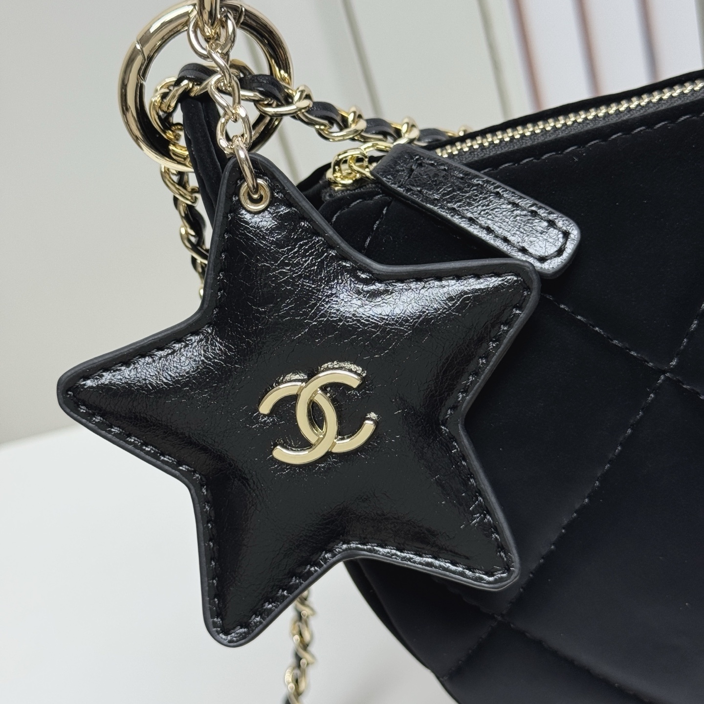 バッグの最大の特徴は、星形のレザー掛け件です。表面にはシャネルの象徴である「ダブルC」ロゴが刺繍されており、アクセントとして目を引きます。裏面には小型ミラーが付いているため、外出先でのメイクチェックにも便利です。