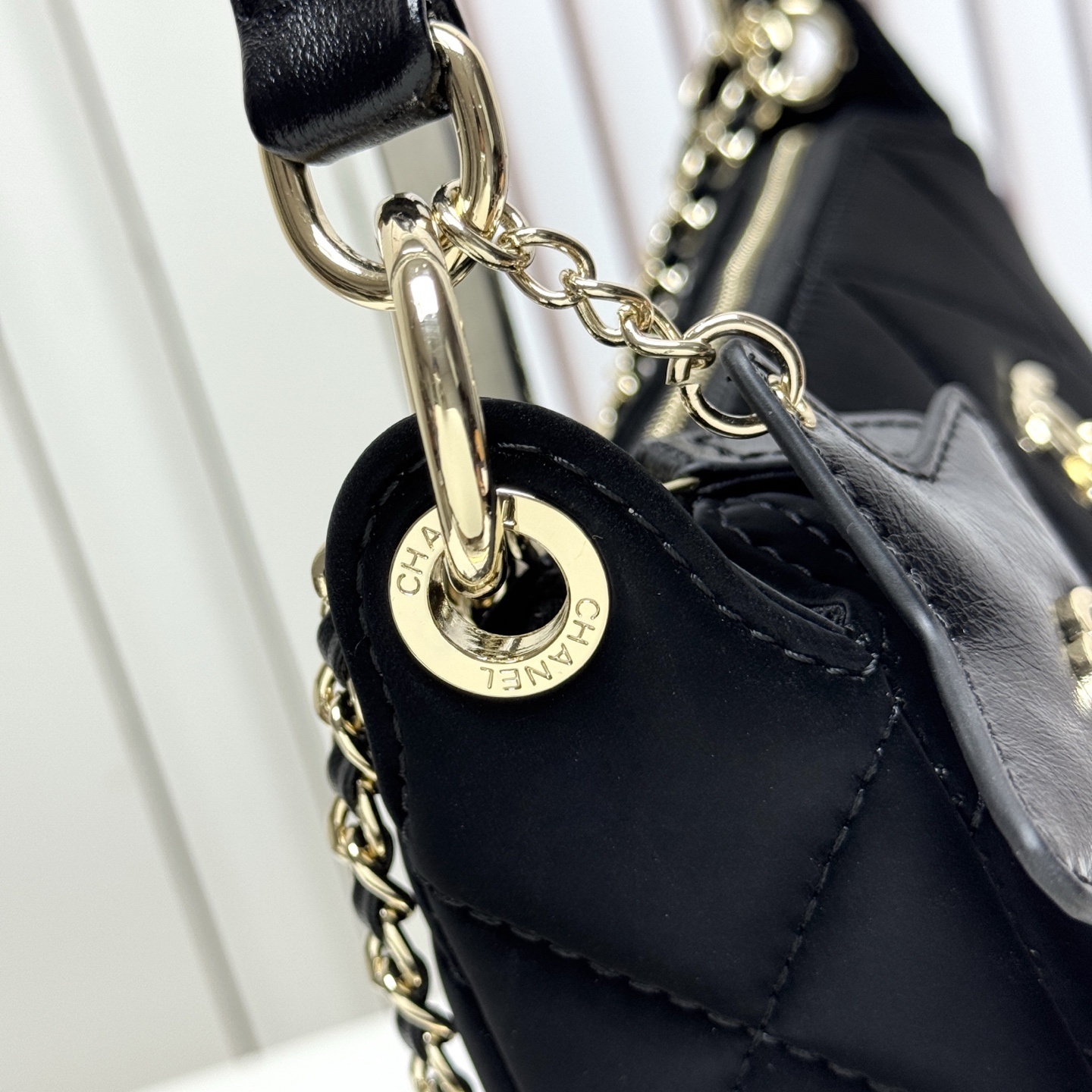 ハンドル部分はレザー巻きメタルチェーンで、長さを調整することでショルダーバッグやクロスボディバッグに変身。短いストラップを使えば手提げにもでき、シーンに合わせたスタイルを楽しめます。