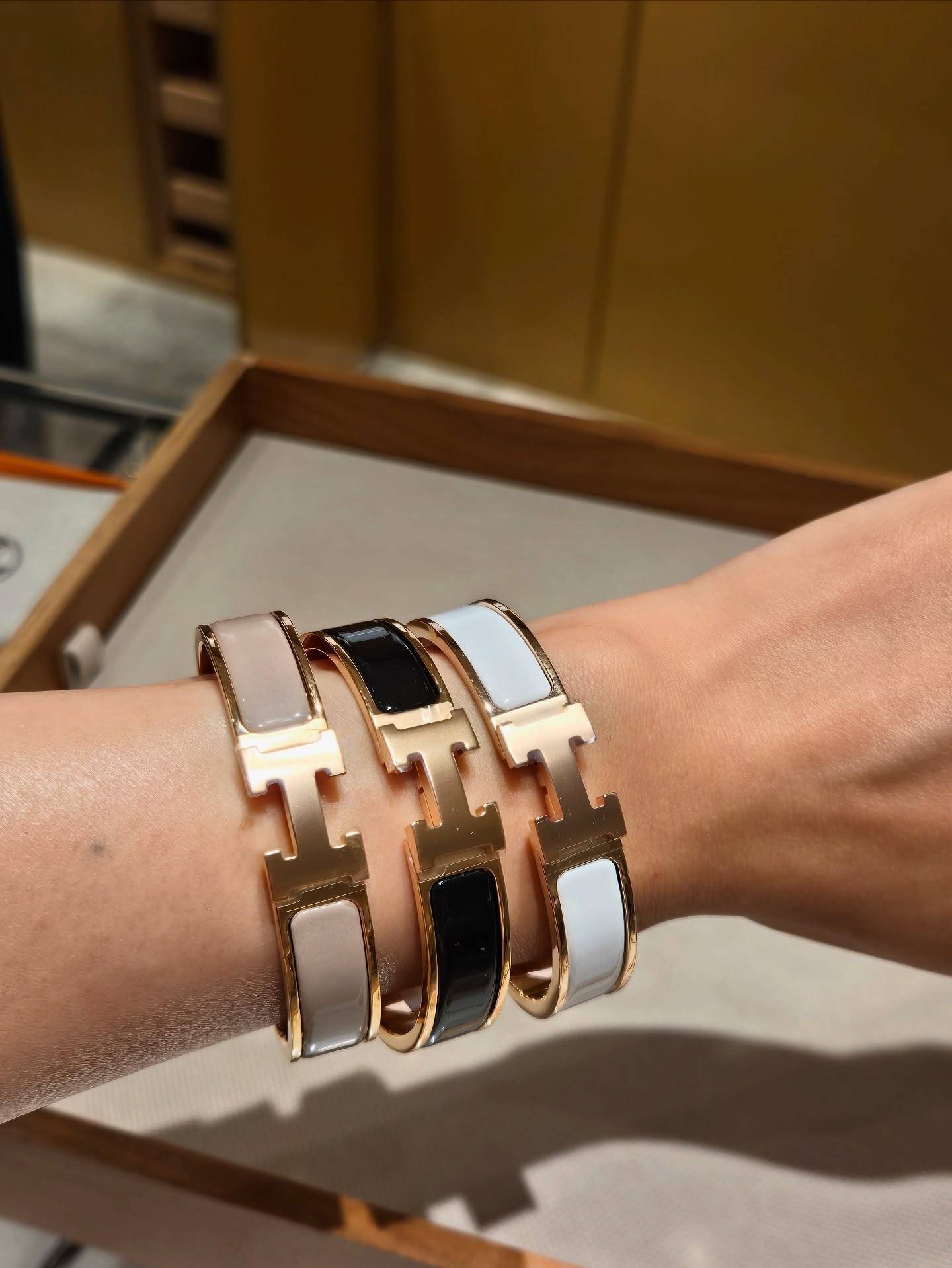 202X年最新モデルの雰囲気を取り入れた、話題のミルクホワイト(オフホワイト)レザーブレスレット。柔らかな乳白色のレザーに、女性らしいローズゴールドのHモチーフがアクセントになった、洗練されたデザインです。