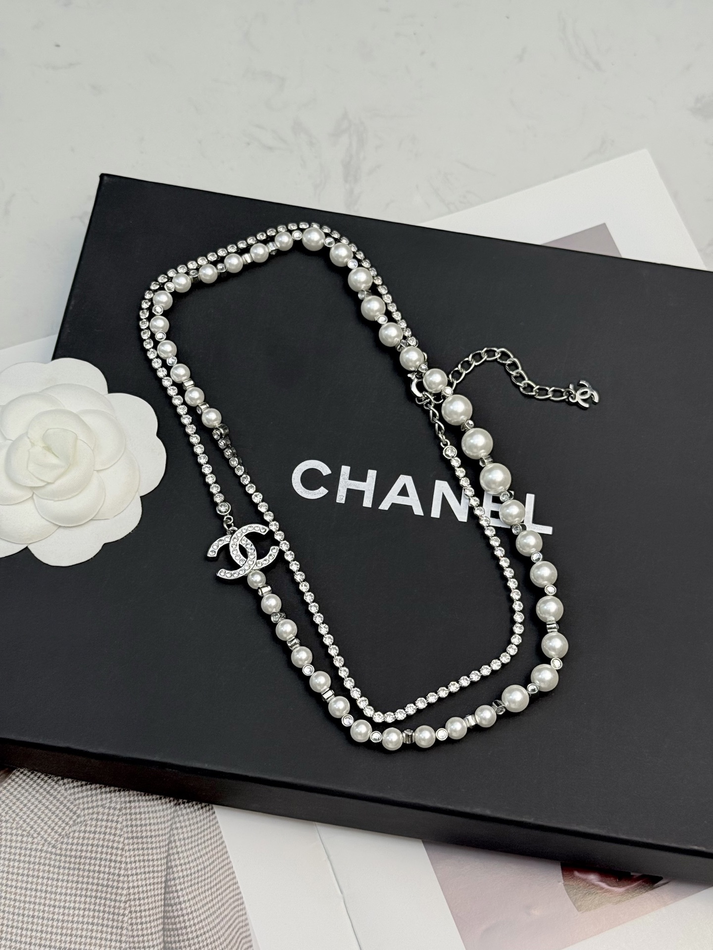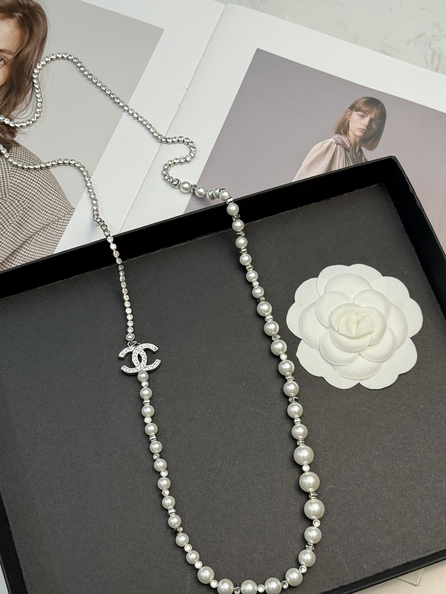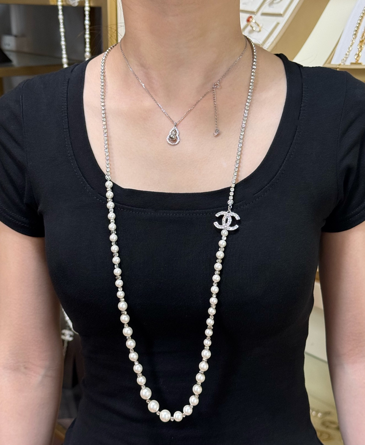 永遠の定番、シャネルの双Cモチーフを贅沢にあしらった、極上のロングパールネックレスです。