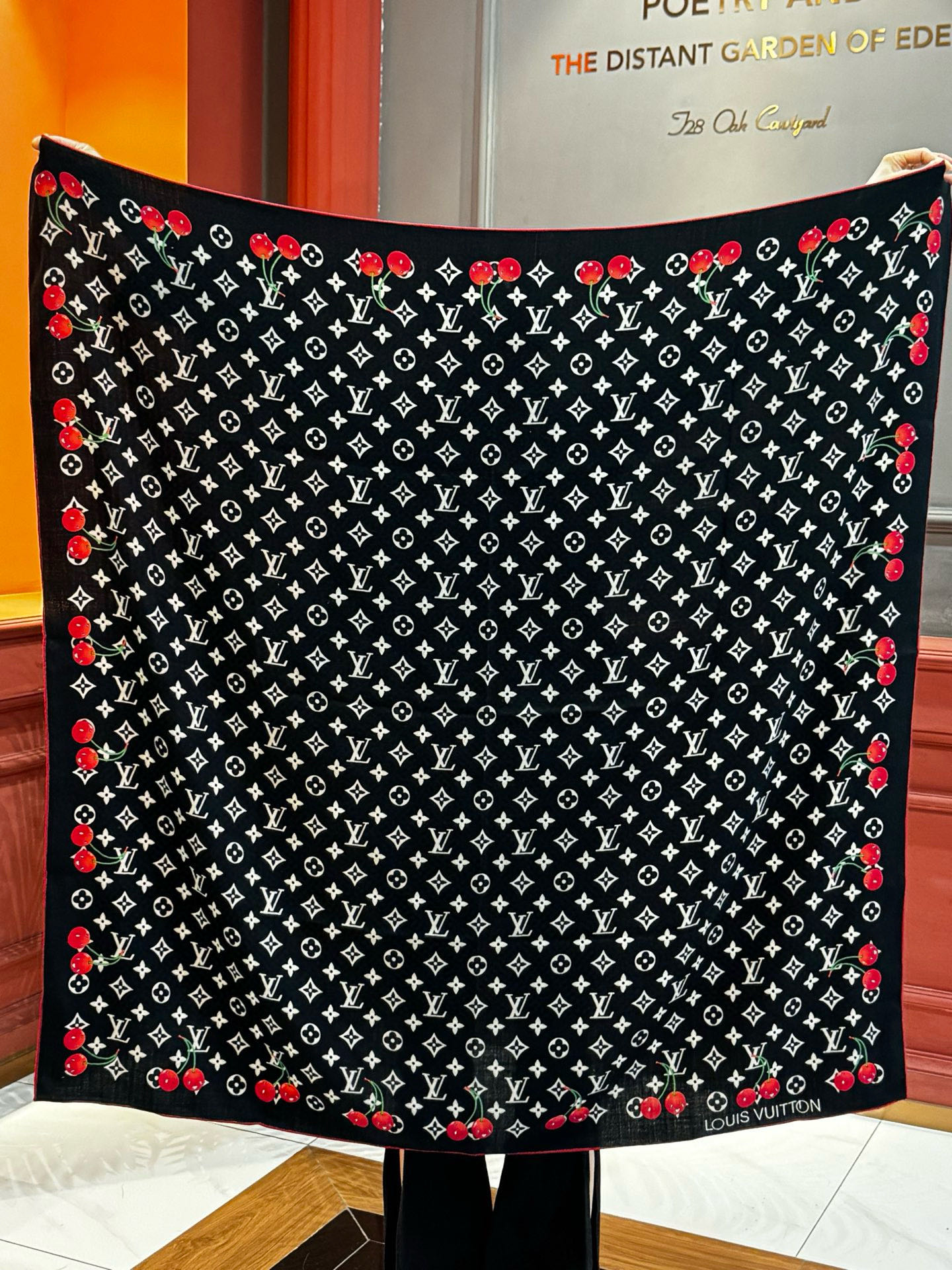 ルイ・ヴィトンと日本のアーティスト・村上隆が共同開発した「セリーズ・モノグラム」スカーフ。伝統的なモノグラムパターンに、村上隆の代表的な「桜チェリー」モチーフを融合。柔らかなベロア生地に立体感のある刺繍を施し、触覚と視覚の両方で芸術性を表現